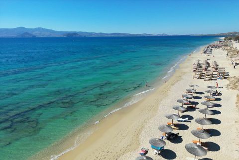 One of the most famous beaches on Naxos, Agios Prokopios boasts soft golden sand and turquoise waters, ideal for swimming and sunbathing. It’s well-organized, with plenty of sunbeds, beach bars, and restaurants. The beach is also sheltered from strong winds, making it perfect for families and visitors looking for a relaxing day by the sea.